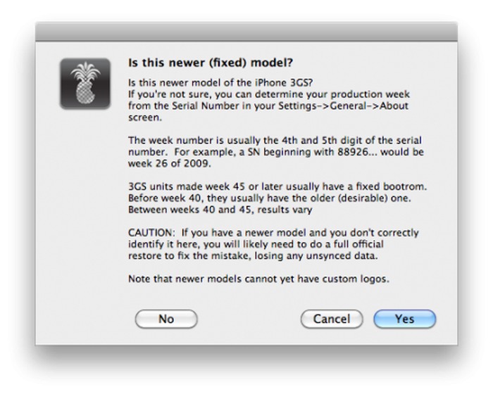 Apabila iPhone 3GS anda merupakan produk minggu ke-40 tahun 2009 ke bawah alias bootrom lama, maka iPhone 3GS anda akan dijailbreak secara untethered .