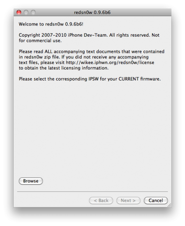 : Hubungkan iPhone 3GS anda ke Mac/PC dan kemudian, luncurkan redsn0w. Pilih Browse.