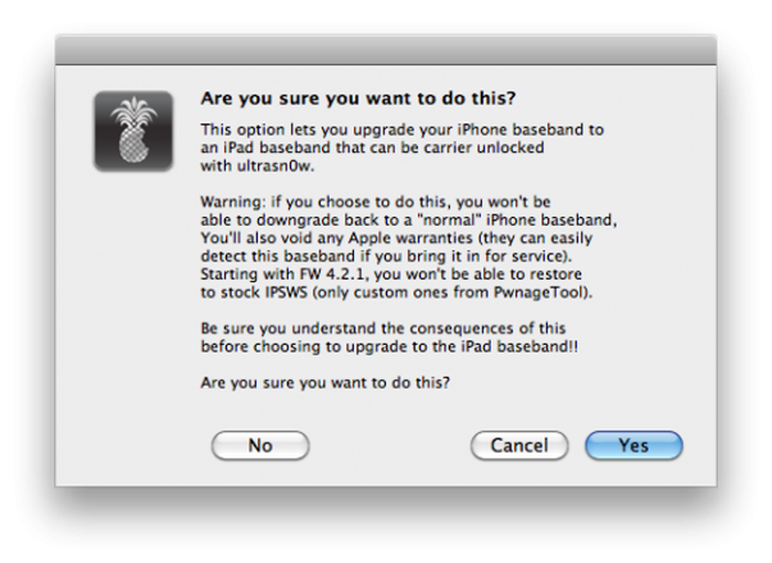 Pilih opsi Install Cydia, dan Install iPad baseband. Saat memilih 'Install iPad baseband', muncul sebuah peringatan, lalu pilih Yes.