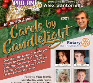 Pro-Am presents Broadway's Alex Santoriello in the 5th annual, "CAROLS BY CANDLELIGHT". Mary Jo Vitale joins Alex December 3rd. Clark Barrios, Dawn DiNome & Kathleen Kane join on December 2, 4 & 5. It's guaranteed to put you in the holiday spirit with Santa & his elves, carols, candles, snow & a live band. ...